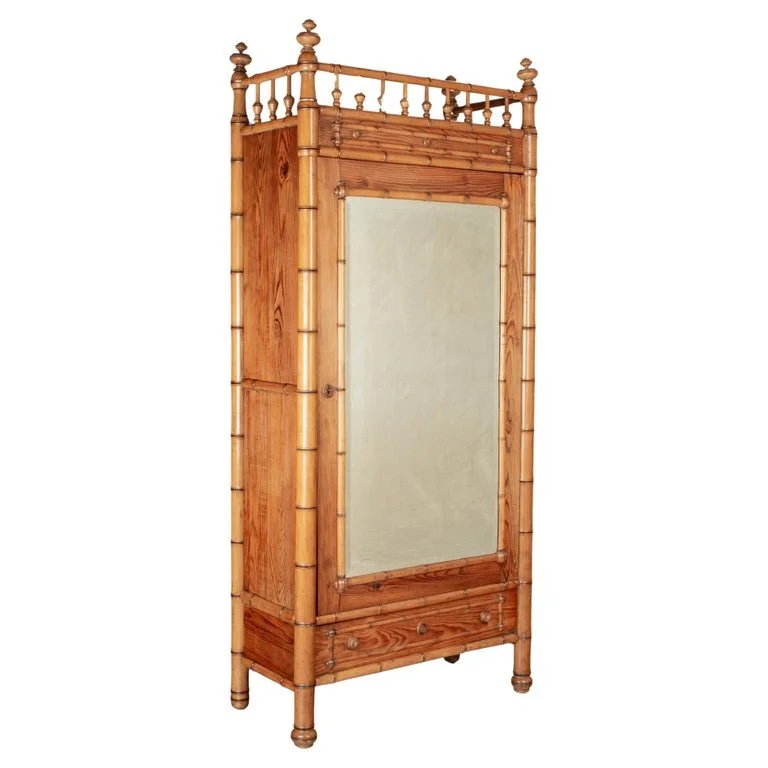 A 19th Century French faux bamboo vitrine or wall cabinet made of pitch pine with turned cherry wood details and finials. Glass paned door with three adjustable shelves. Brackets on the back to hang on the wall. All original. In very good condition. Missing four corner decorations on the door and some elements on the top crest. Perfect for use as a bathroom apothecary cabinet or a free-standing display cabinet for small collectibles. Circa 1870-1890. This is part of a bedroom suite that includes an armoire. Please see other listings.