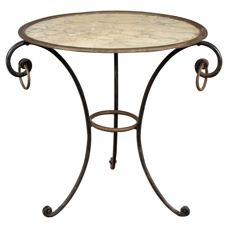A rustic salvaged ship's portal repurposed into a wall mirror. Mounted to an oak frame with a small ledge or shelf. Pale gray painted steel with minor loses. White glove delivery only because of heavy weight.