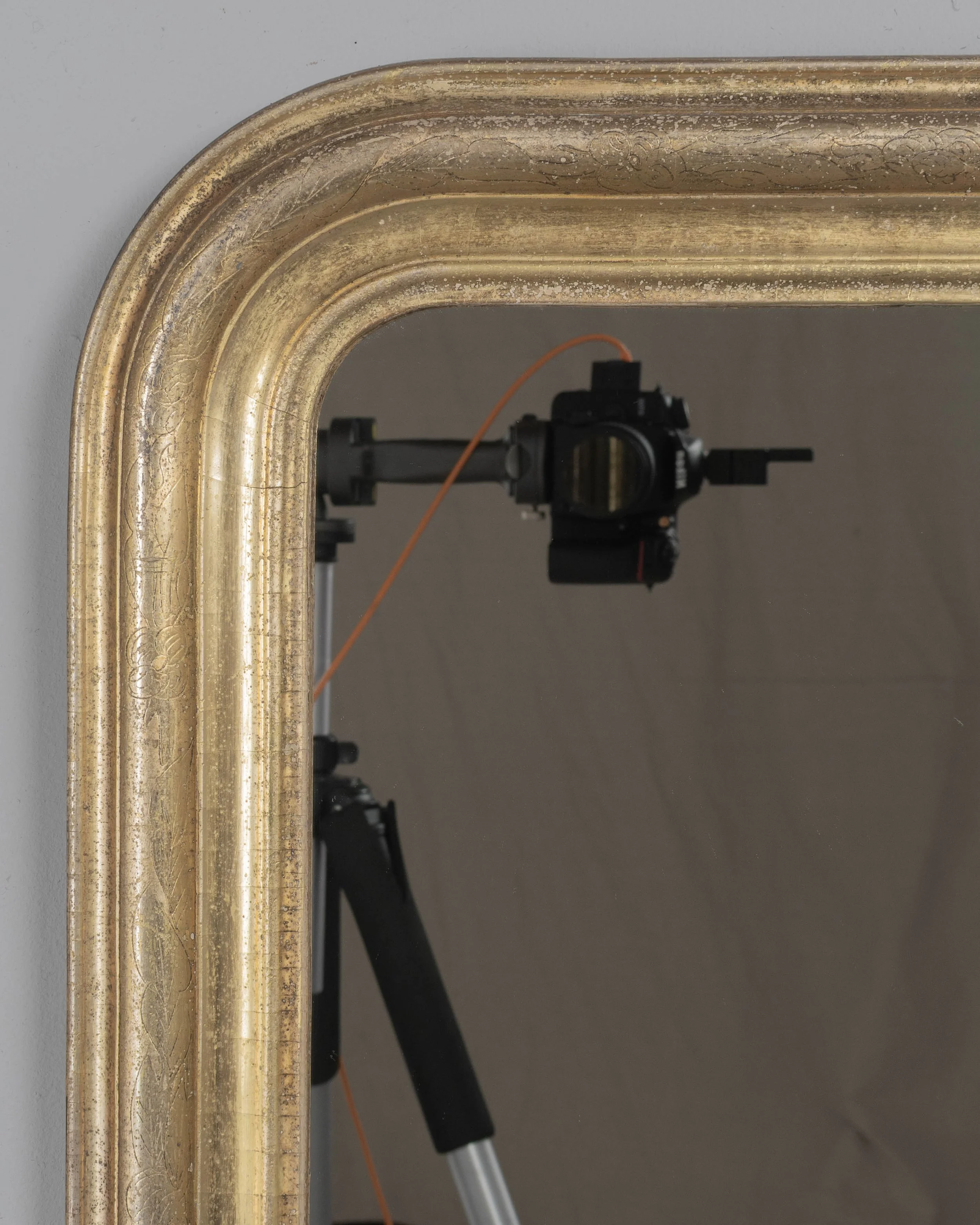 An early 20th century French Louis Philippe style mirror with curved top corners, incised floral decoration and bright gilt finish. New 1/4” thick mirror. Two wood planks on the back are replaced. Please refer to photos for more details. Pictures are part of the description.